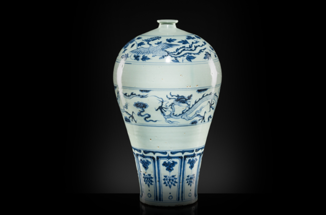 AN EXCEPTIONAL AND IMPORTANT BLUE AND WHITE 'DRAGON AND PHOENIX' VASE, MEIPING, YUAN DYNASTY