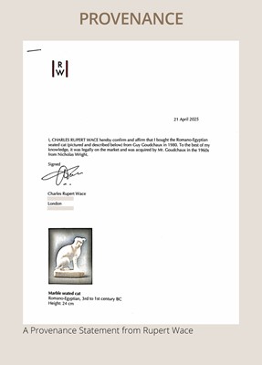 “I, CHARLES RUPERT WACE hereby confirm and affirm that I bought the Romano-Egyptian seated cat (pictured and described below) from Guy Goudchaux in 1980. To the best of my knowledge, it was legally on the market and was acquired by Mr. Goudchaux in the 1960s from Nicholas Wright.”