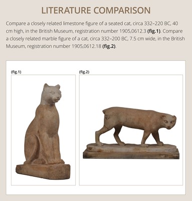 Compare a closely related limestone figure of a seated cat, circa 332–220 BC, 40 cm high, in the British Museum, registration number 1905,0612.3. Compare a closely related marble figure of a cat, circa 332–200 BC, 7.5 cm wide, in the British Museum, registration number 1905,0612.18.
