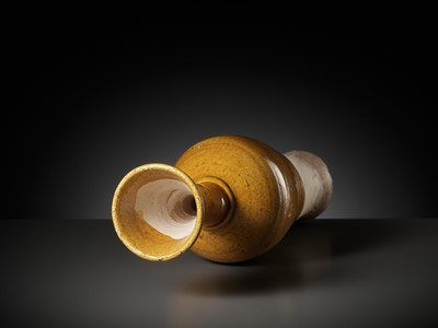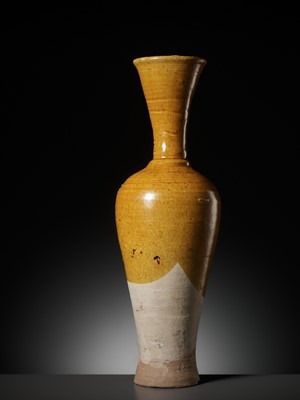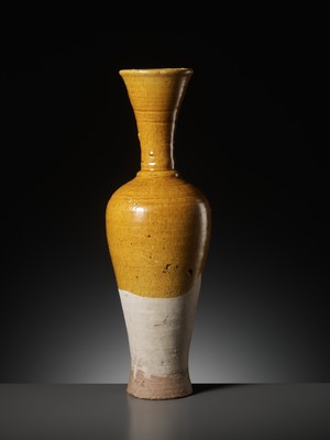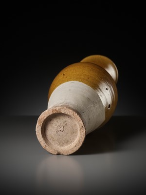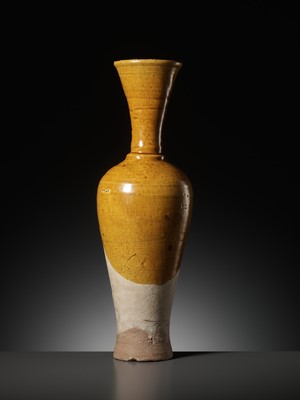 China, 907-1125. The elongated ovoid body rising to a tall flared rim, covered with a lustrous amber glaze pooling in the recesses and stopping in an irregular line above the unglazed base and foot.