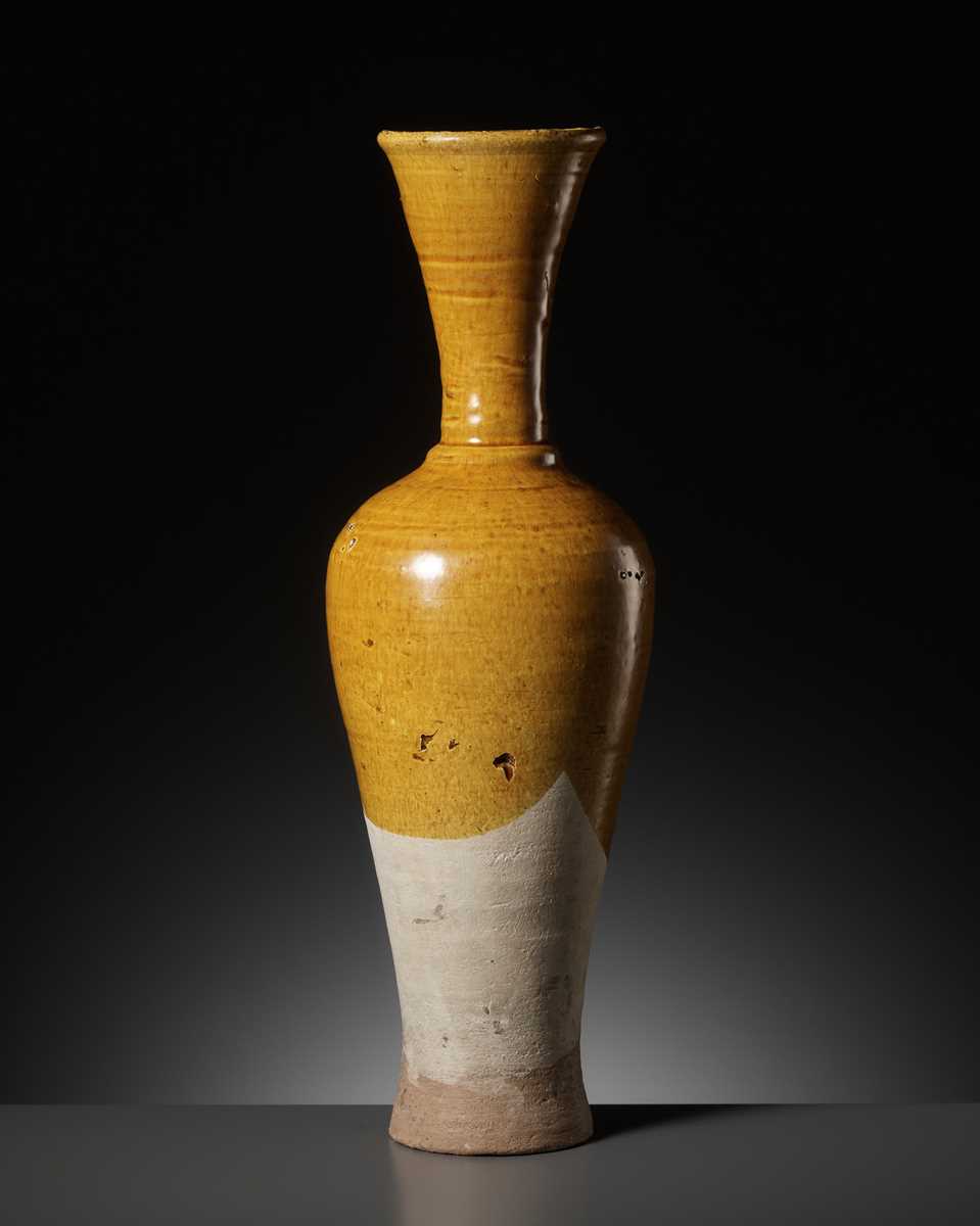 The attenuated tall form is a classic Liao shape. This type is generally monochromatic with either an amber or a green glaze. Similar examples are known from Liao burial sites in Liaoning province and Inner Mongolia illustrated in Liaoci Xuanji, A Collection of Liao Tomb Relics of the Liao Dynasty, Beijing, 1961, pl. 345, and another is illustrated in Li Zhi Yan, The Art of Glazed Pottery of China, Hong Kong, 1989, no 239. Green-glazed examples of this form are found in two museum collections, The Asian Art Museum of San Francisco, object number B60P1103, illustrated in He Li, Chinese Ceramics, London, 1996, p. 146, no. 208 and in The Boston Museum of Fine Arts accession number 50.891, illustrated in The Charles B. Hoyt Collection in the Museum of Fine Arts, Boston, vol. II, Boston, 1972, no. 4.