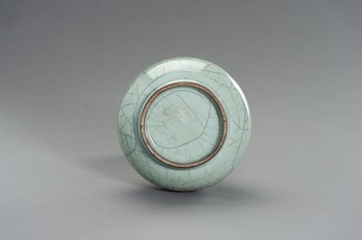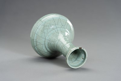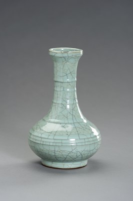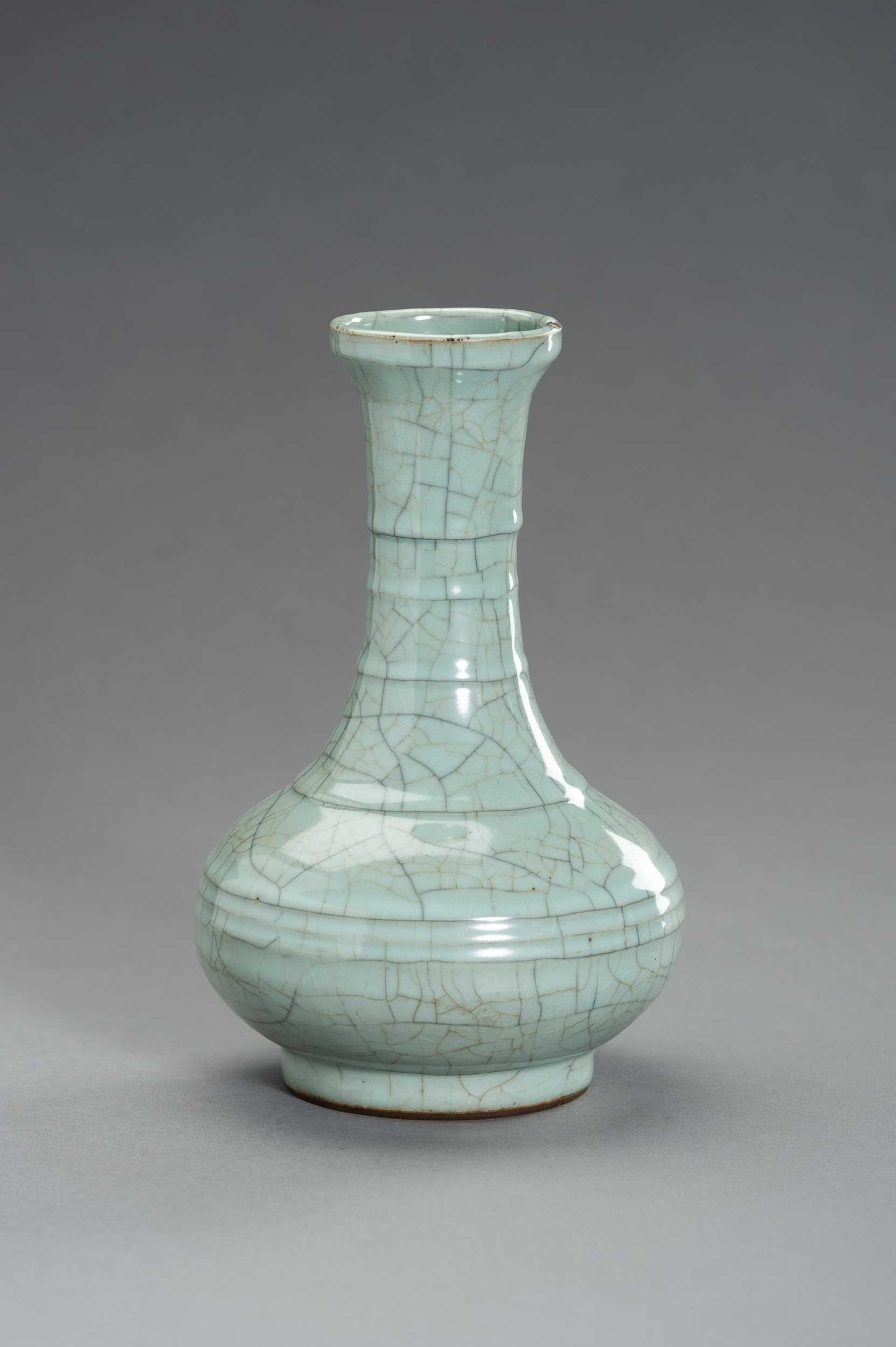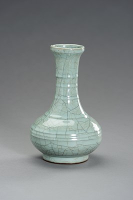 China, Qing Dynasty (1644-1912). The compressed globular body is surmounted by a tall cylindrical neck with three horizontal ribs, spaced further apart than the ribs at the body, and tapering to the wide rounded mouth, covered overall in a celadon glaze suffused with dark grey and russet crackles.